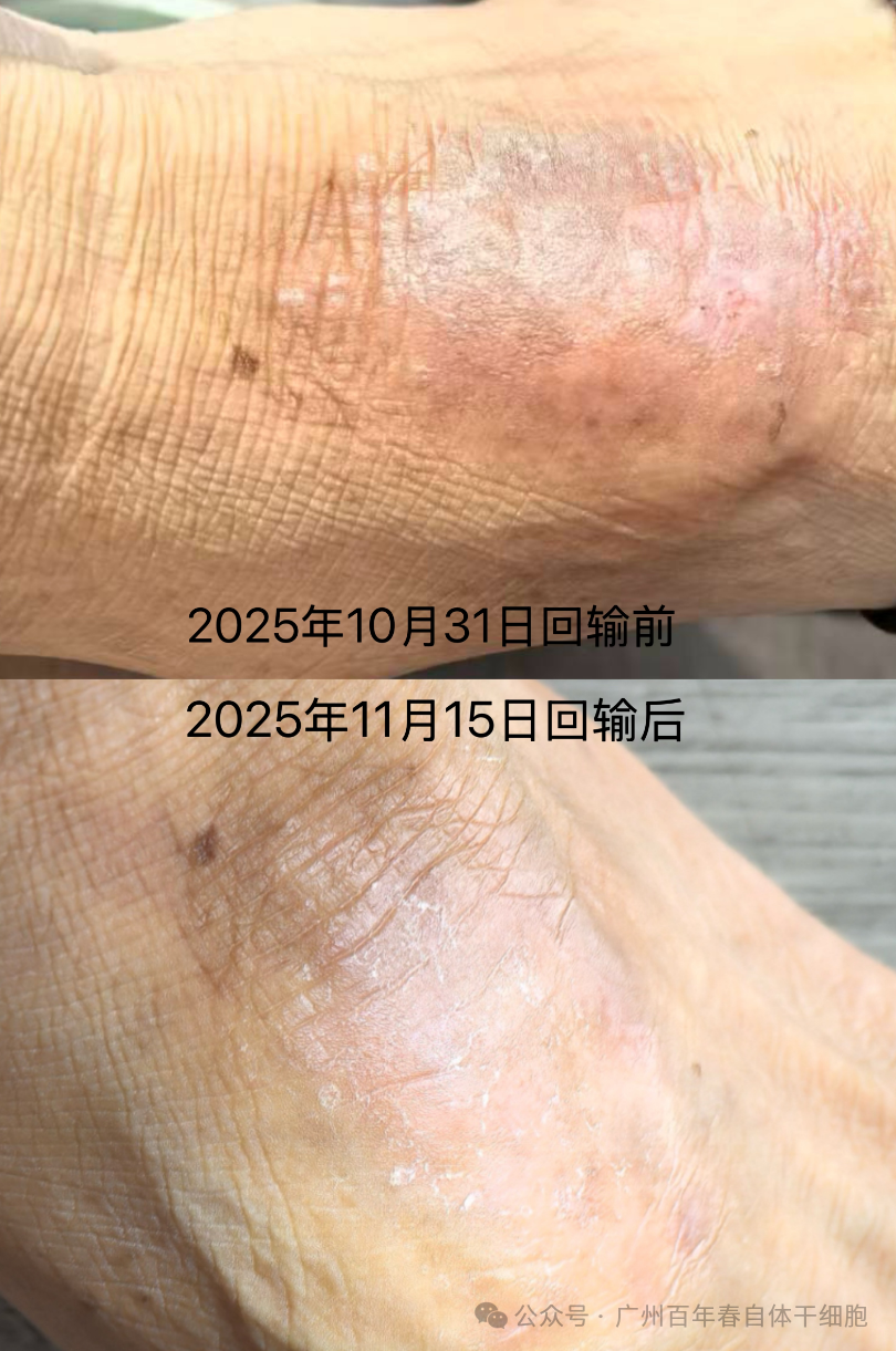 2025年11月15日,在准备进行第二次细胞回输(2.96亿个细胞) 之前,医疗团队拍摄记录下了林先生皮肤溃疡的变化——原来长期溃烂的创面,已经开始结痂、愈合!